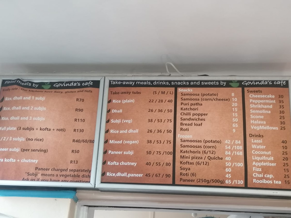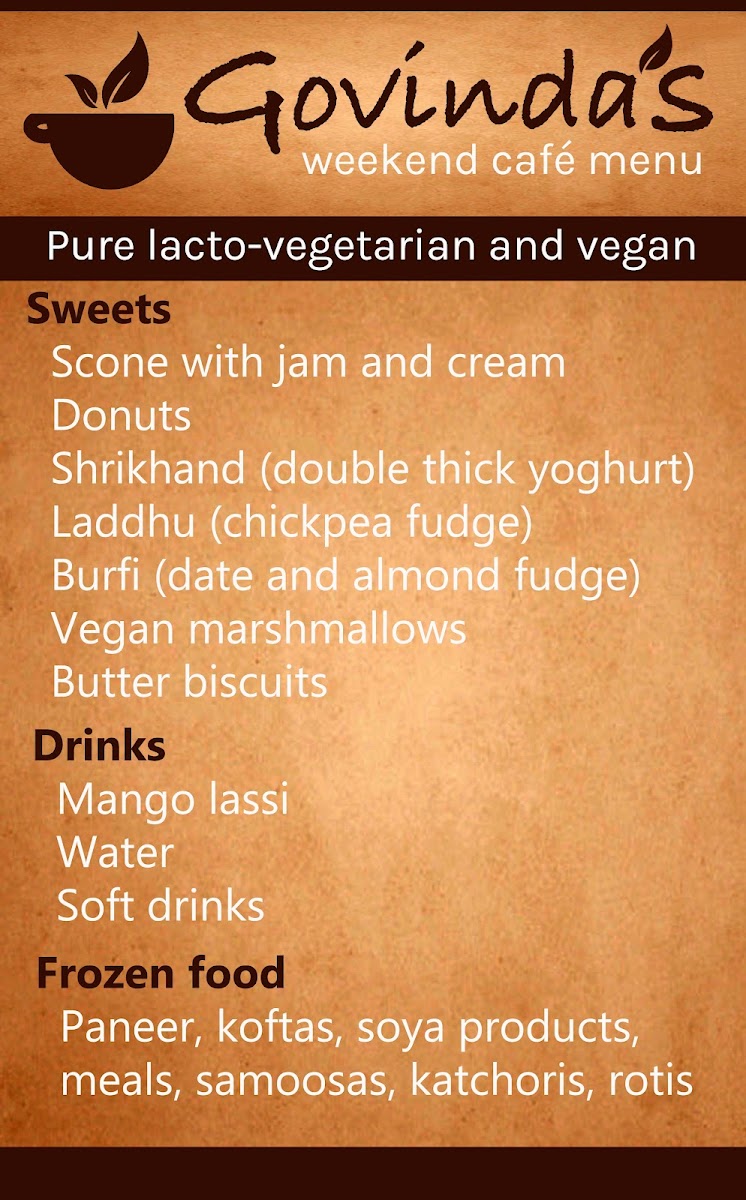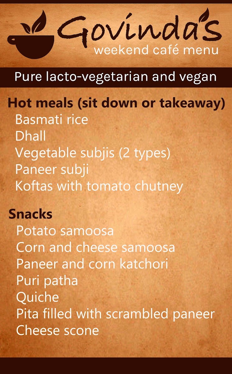 The menu at Govinda's Weekend Cafe offers a variety of vegetarian and vegan-friendly options suitable for light meals, snacks, and casual dining occasions. It is organized into distinct groups to facilitate easy selection based on preference and mealtime.